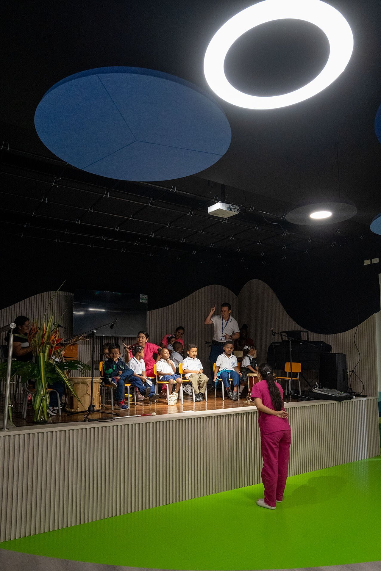 Un salón de actos reconstruido y adaptado para que los niños y niñas participen en actividades culturales y artísticas.
